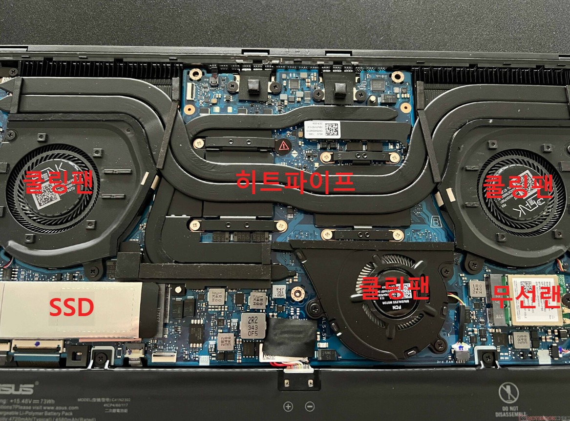 14인치 노트북임에도 외장 그래픽카드칩을 포함하고 있어 무려 3개의 쿨링팬을 집어넣었습니다. 히트파이프도 큰 히트파이프가 2개 그리고 메인보드의 쿨링을 도와주는 방열판들이 붙어있습니다. SSD도 방열판을 붙일정도로 쿨링에 신경을 쓴 모습입니다. 참고로 asus의 게이밍 노트북은 써멀을 리퀴드메탈(액체금속)을 이용하여 열전도율을 극한으로 끌어올리기로 유명합니다. 해당 제품에도 사용되었고 만약 써멀을 재도포하신다면 꼭 as업체에 방문해서 하시길 바랍니다.